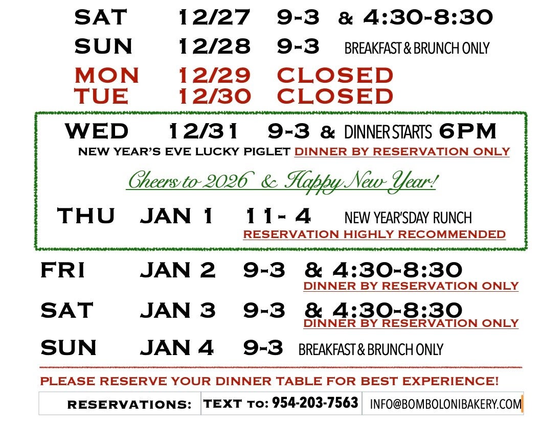 We recommend checking this page closer to each holiday for the most up-to-date information. We look forward to celebrating with you at Bomboloni Bakery & Café in Jensen Beach, Florida!