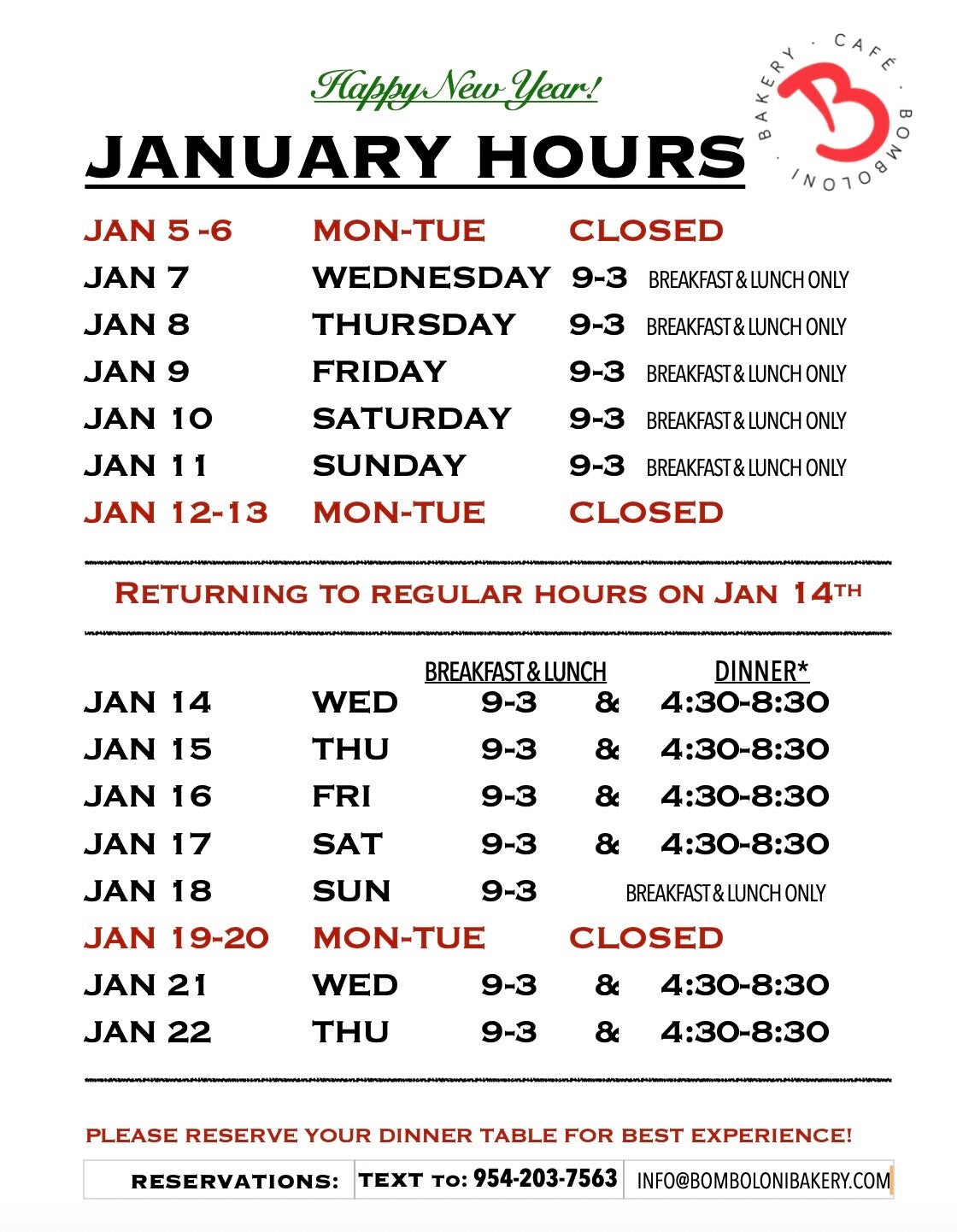 Please check our New Year's Eve & Day Menu page for details on our new Menu, New Year's Hours, special items and promotions.