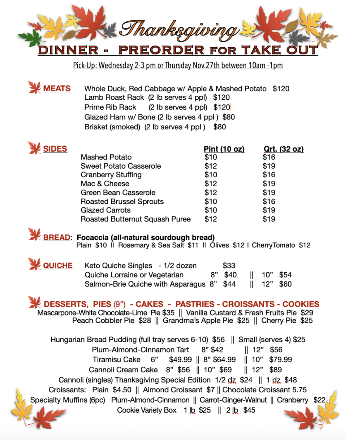 Thanksgiving is right around the corner... We are here to make your holiday stress-free and your meals unforgettable! See our Preorder Menu below. This year, we are offering a menu of gourmet entrées, fresh made sides, artisan bread and festive desserts - all handcrafted with LOVE in our kitchen.
